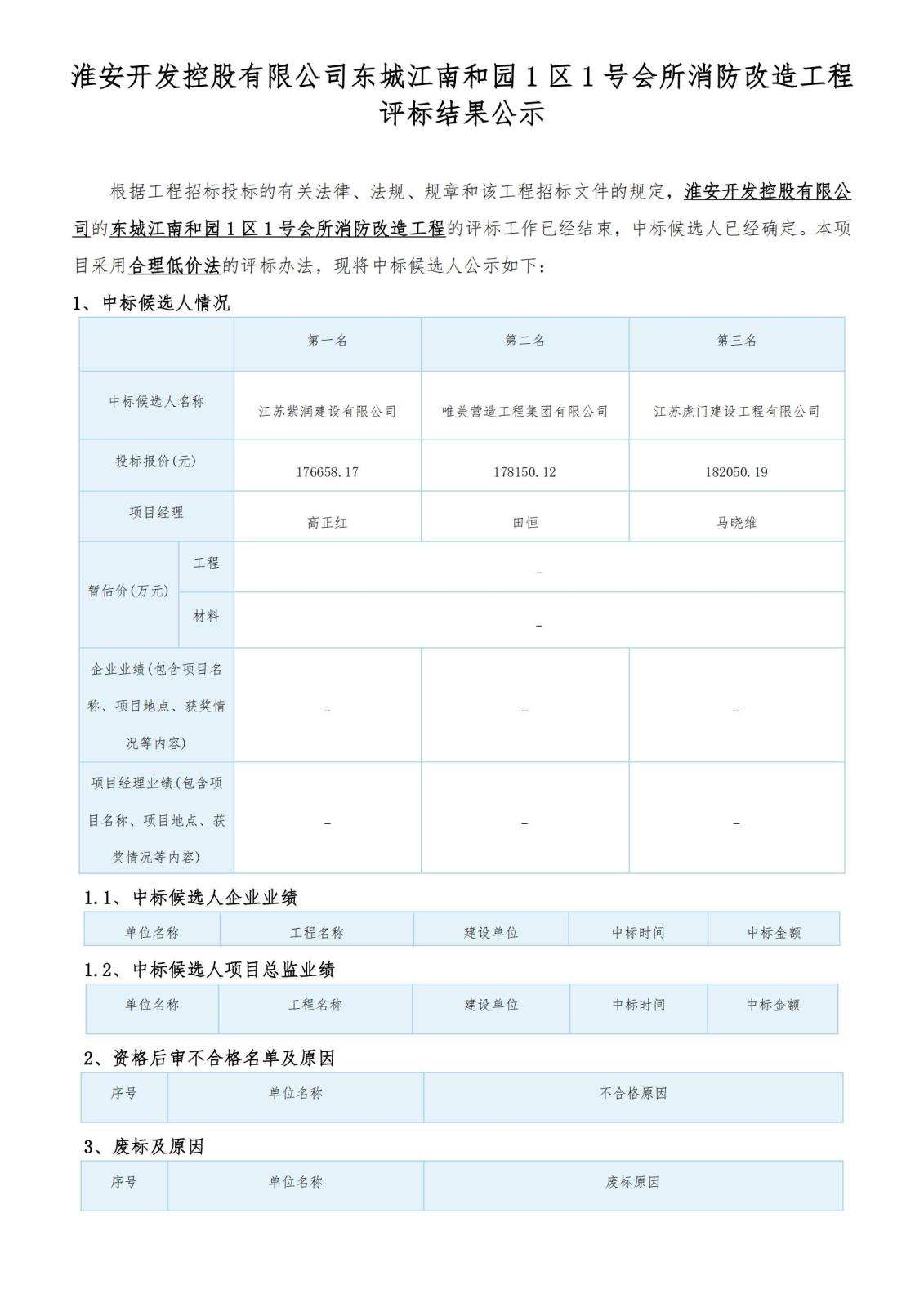 淮安開發(fā)控股有限公司東城江南和園1區(qū)1號會所消防改造工程 評標結果公示